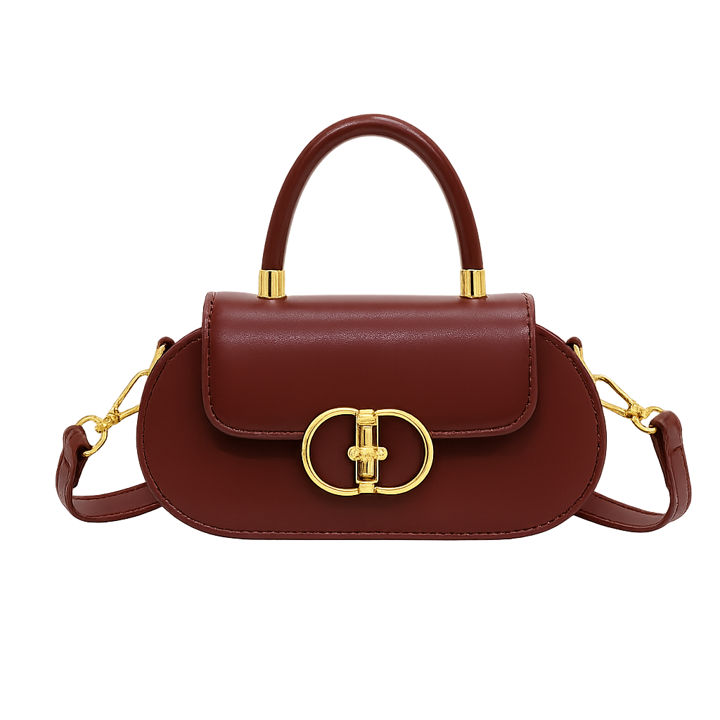 Sophistication meets practicality with this timeless dark brown oval satchel. Its smooth faux leather finish and distinctive gold oval buckle give it a refined yet bold look. Compact yet functional, it’s designed for both casual elegance and polished formality.