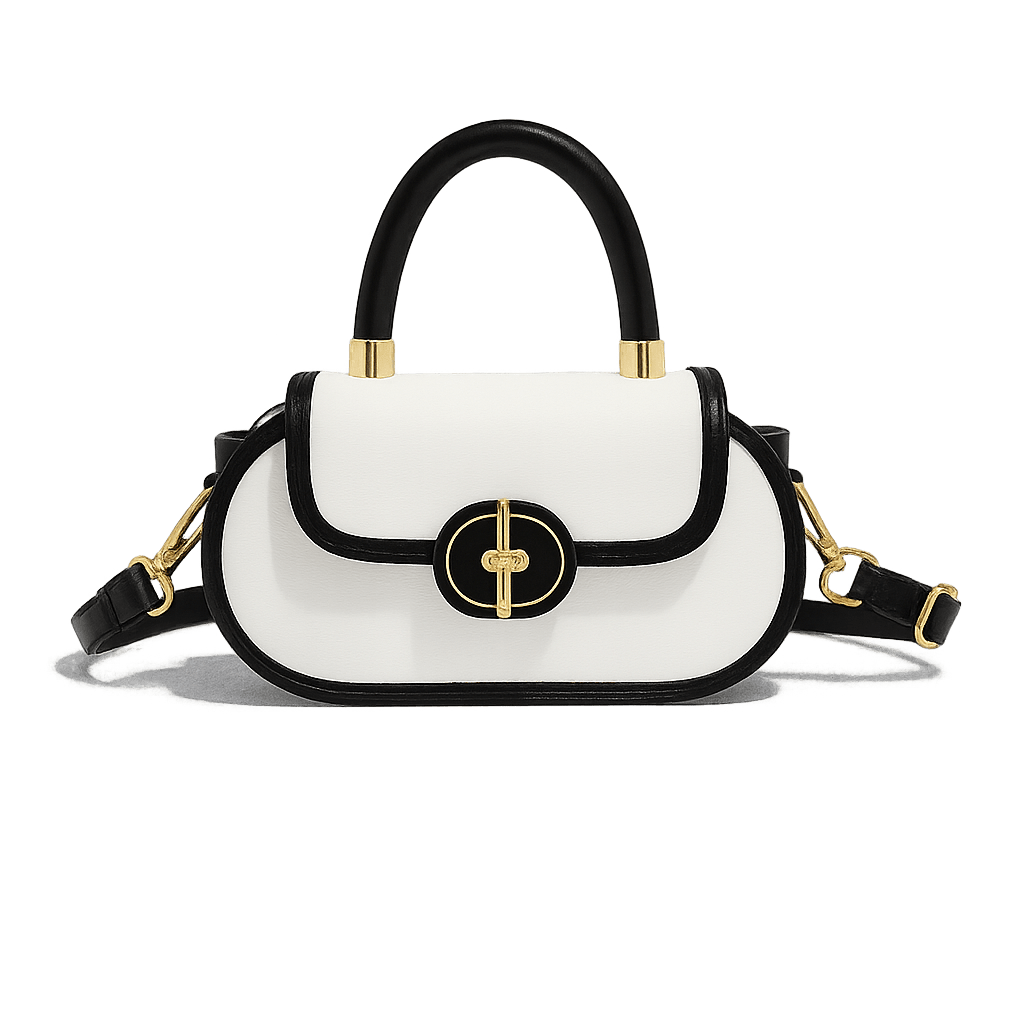 A stunning fusion of classic sophistication and modern minimalism, this monochrome mini satchel showcases a crisp white body with bold black trim. Its elegant oval flap, top-handle silhouette, and gold turn-lock closure create a statement piece that complements any outfit—from sleek workwear to evening ensembles.