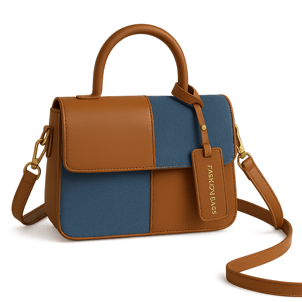 A sleek two-tone handbag with a stylish colorblock design in brown and blue, perfect for adding polish to your everyday and professional looks.